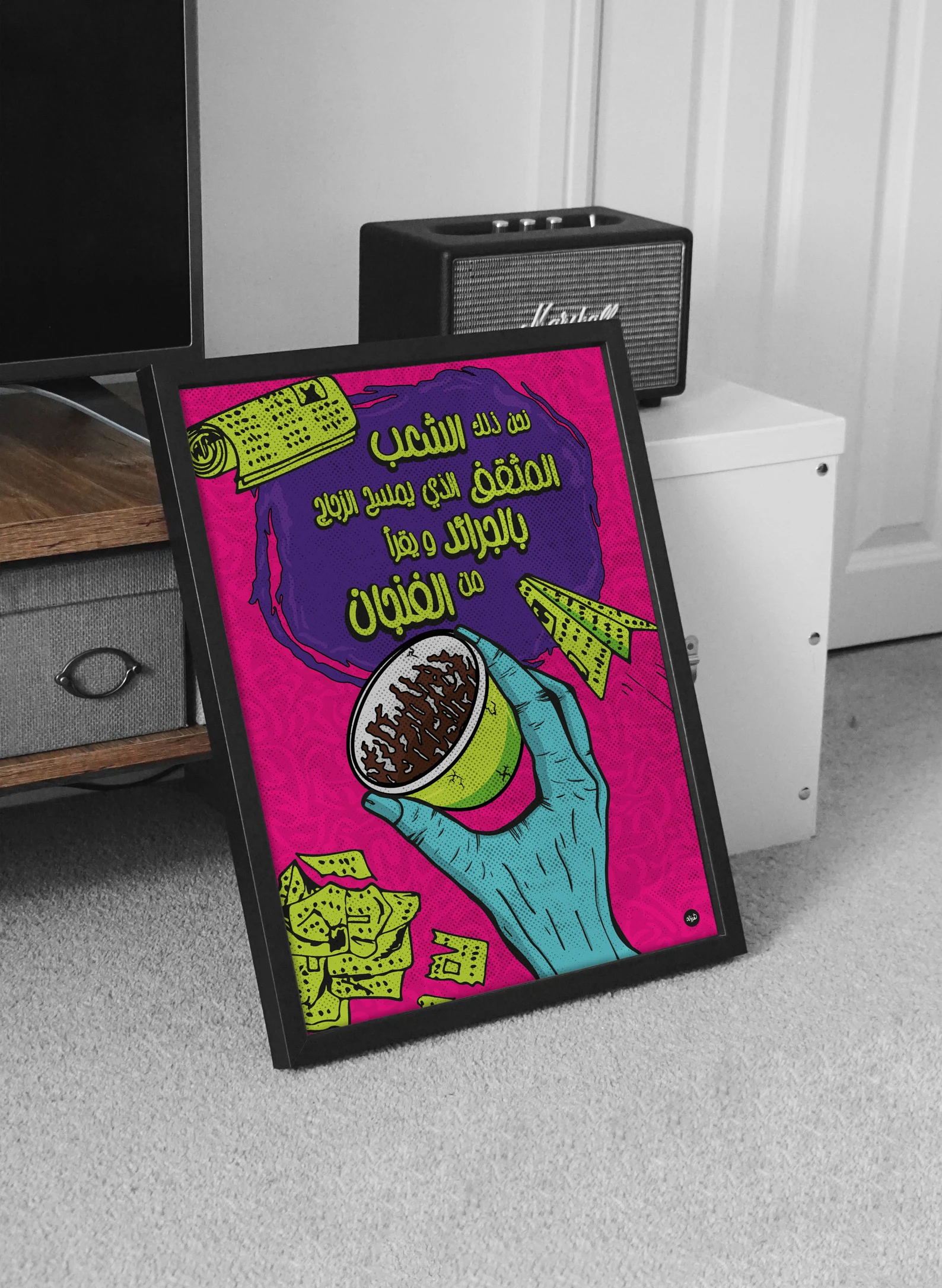 The design combines bold, expressive lettering with vibrant colors and pop-art-inspired elements. A hand holding a traditional coffee cup, surrounded by newspaper pieces, illustrates the irony and wit in Qabbani’s words. The playful style and color choices highlight the juxtaposition between intellectual culture and everyday superstitions.
