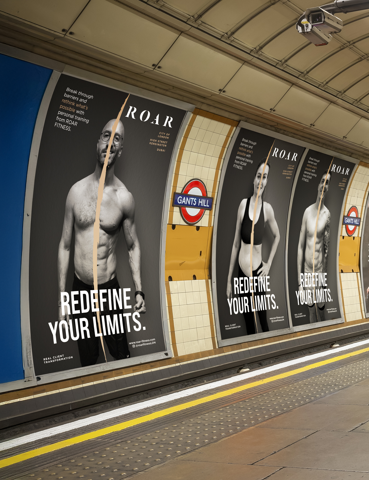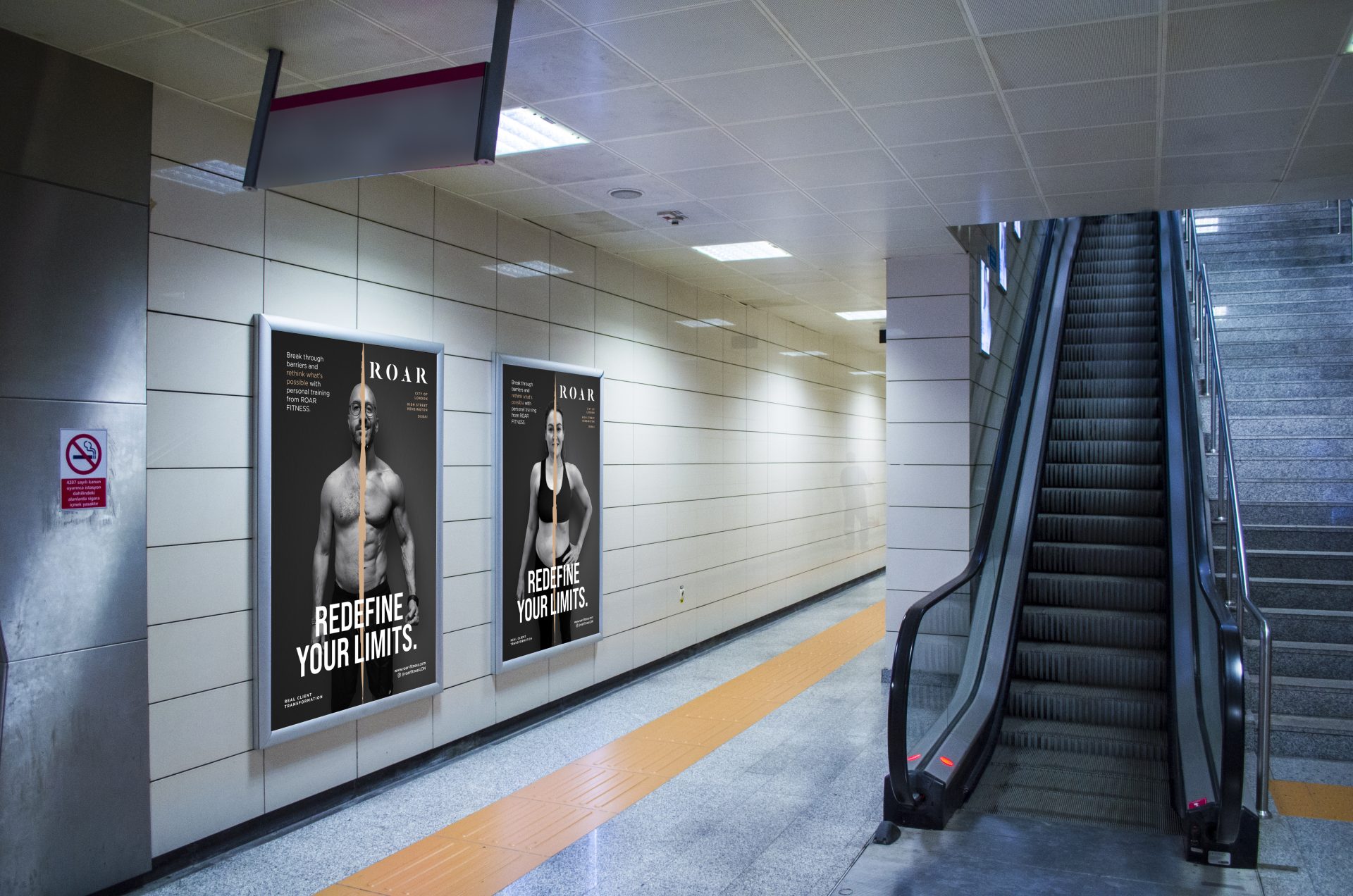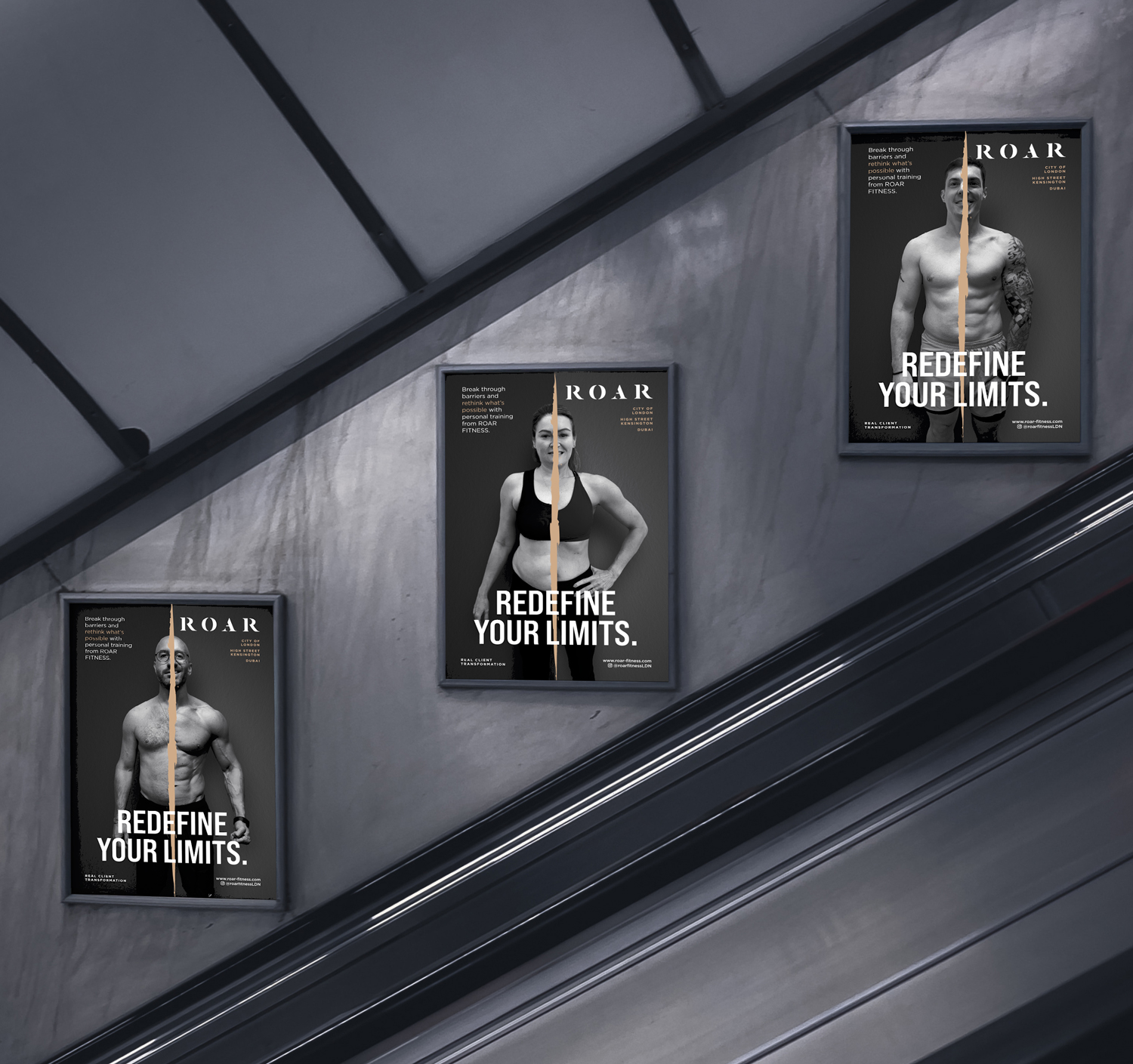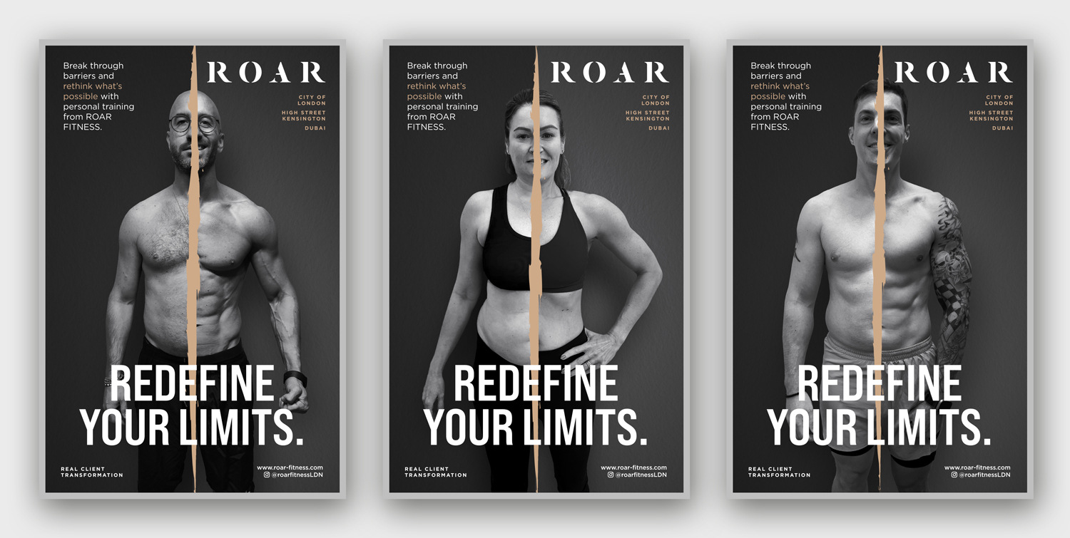 These London Underground ads for ROAR Fitness feature a bold and transformative design concept, utilizing a powerful “before-and-after” visual split by a dramatic torn effect that symbolizes breaking barriers and rethinking limits. The black-and-white portraits of real clients highlight authenticity, with the transformation showcased to inspire potential customers. The bold, sans-serif headline “REDEFINE YOUR LIMITS” anchors the composition, while supporting text reinforces the message of possibility through personal training. The overall tone is aspirational yet grounded, delivering an impactful message of achievable fitness results.