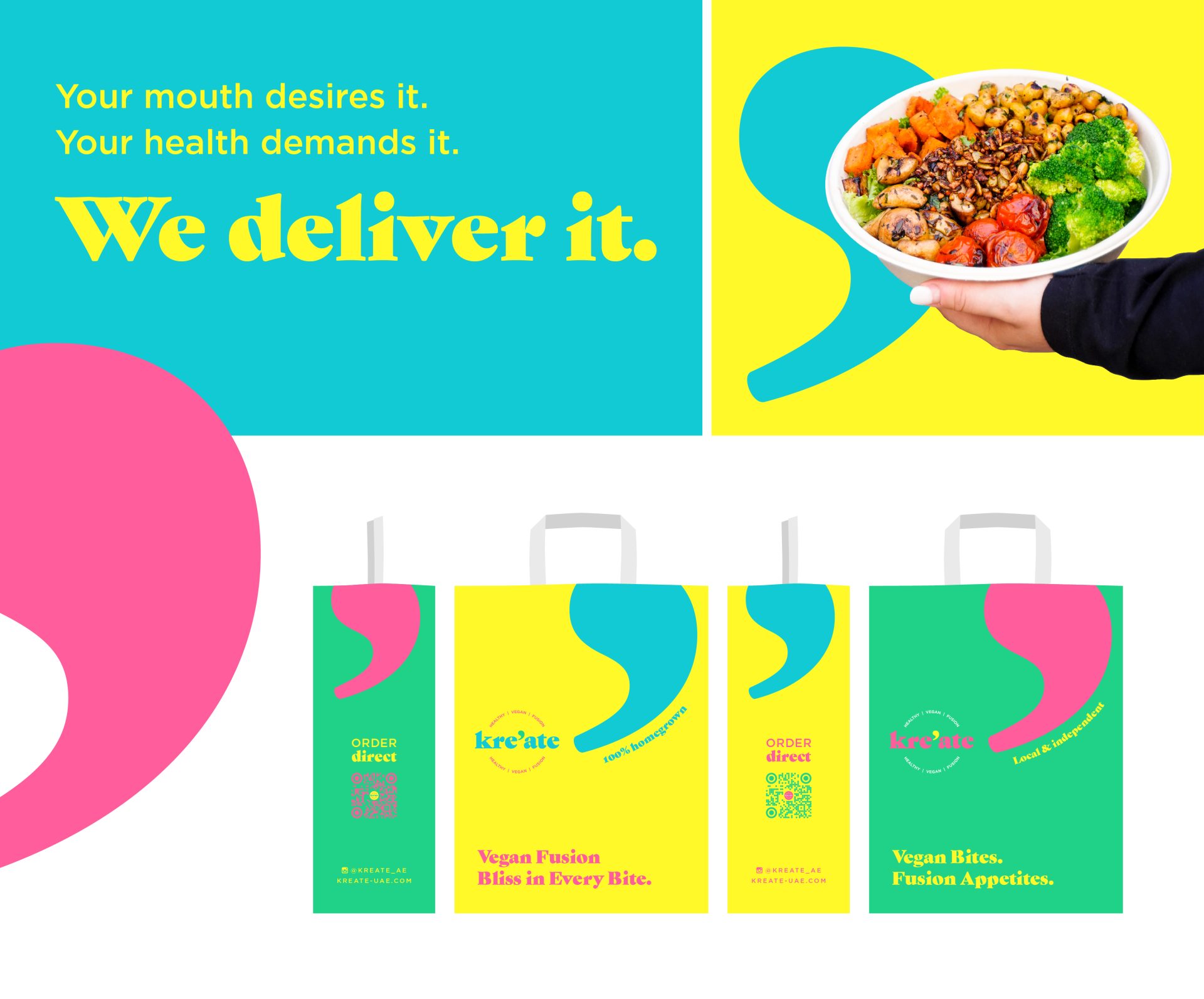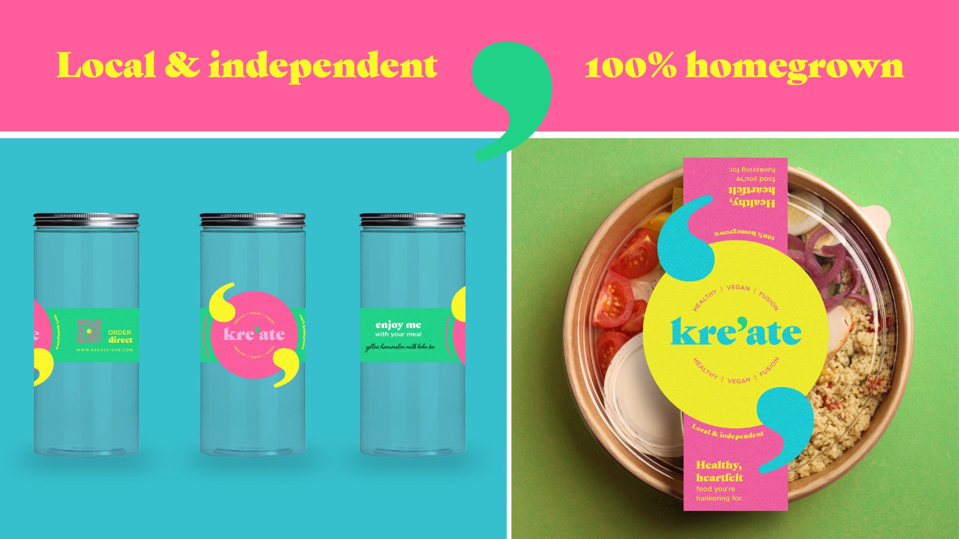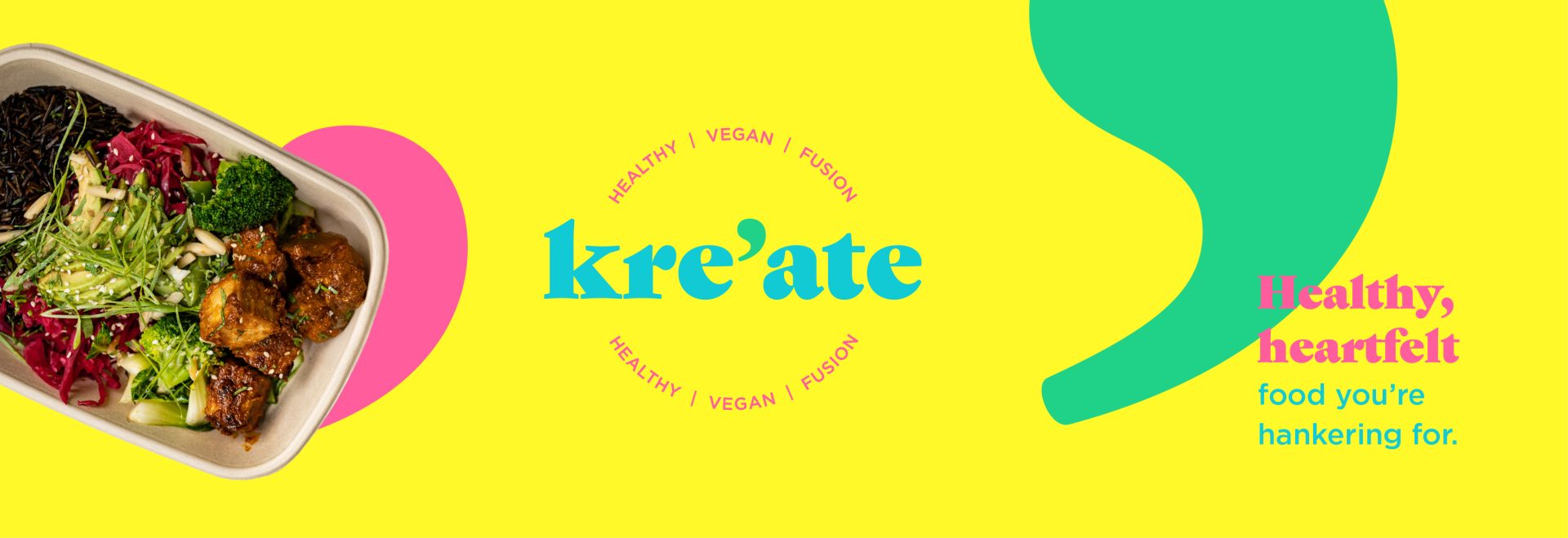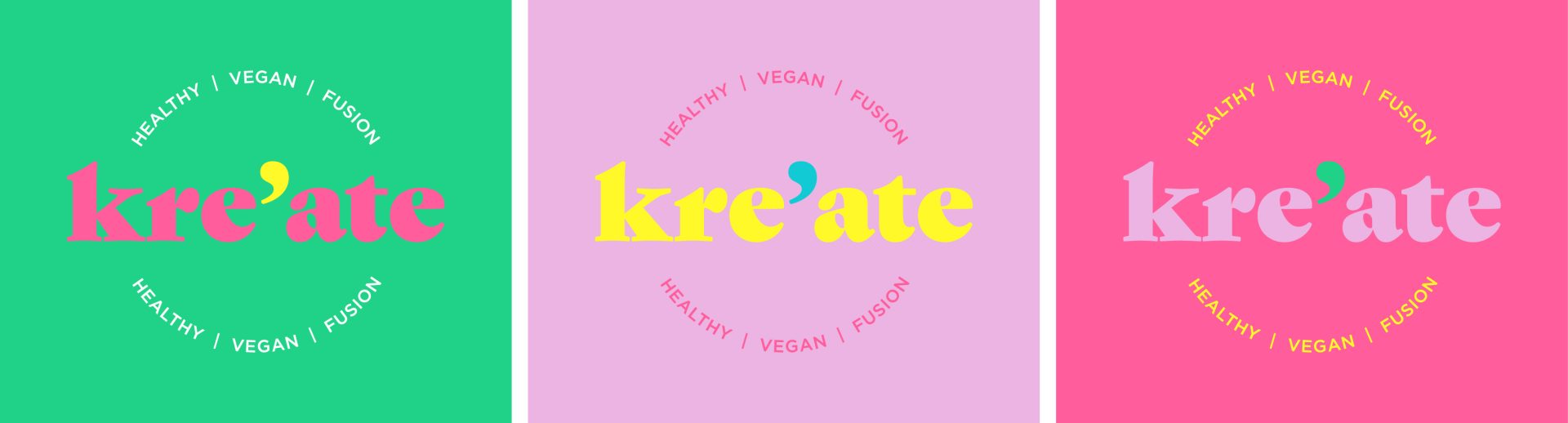Develop bold, playful branding for Kre’ate, a vegan restaurant, reflecting its fresh, energetic personality and modern, health-conscious appeal.