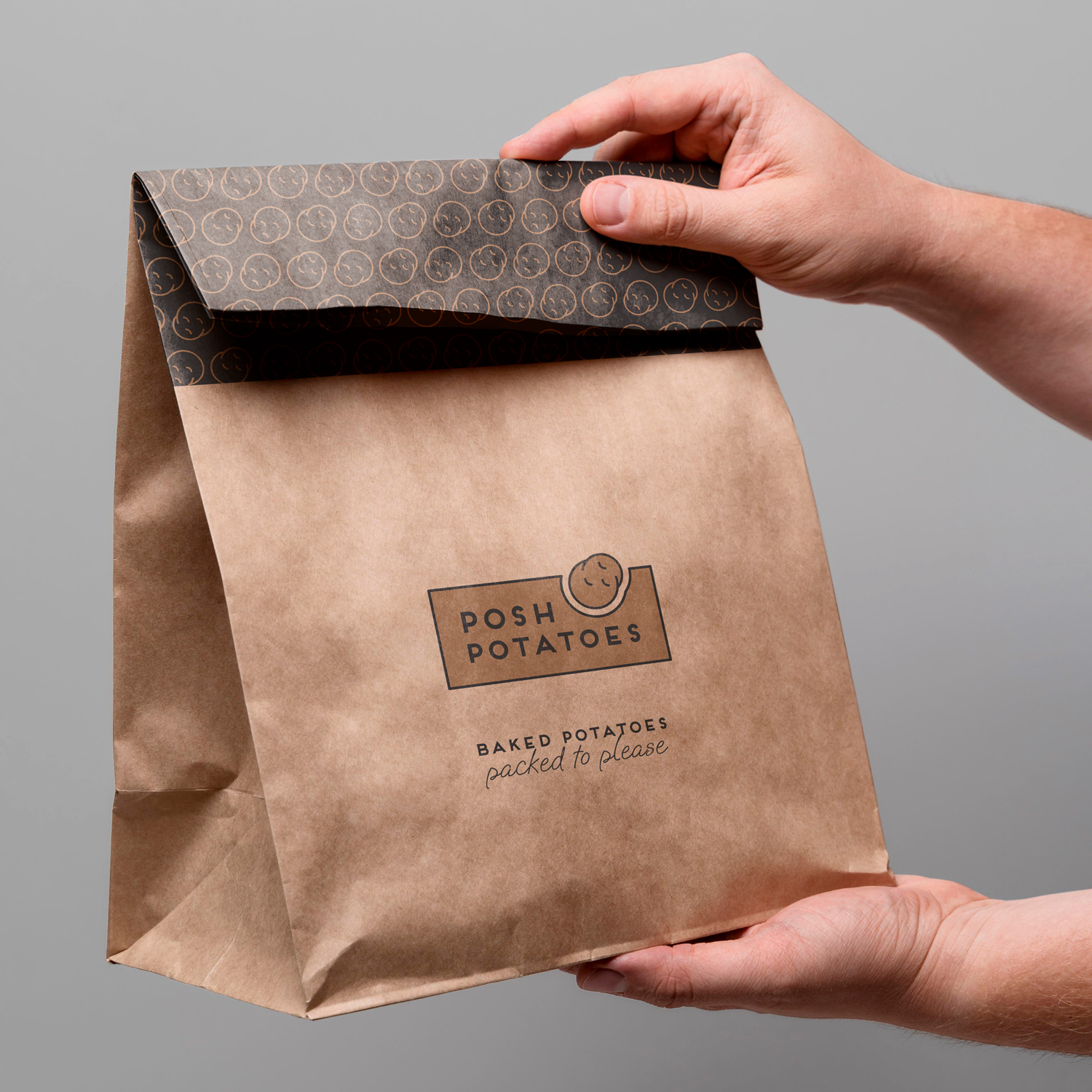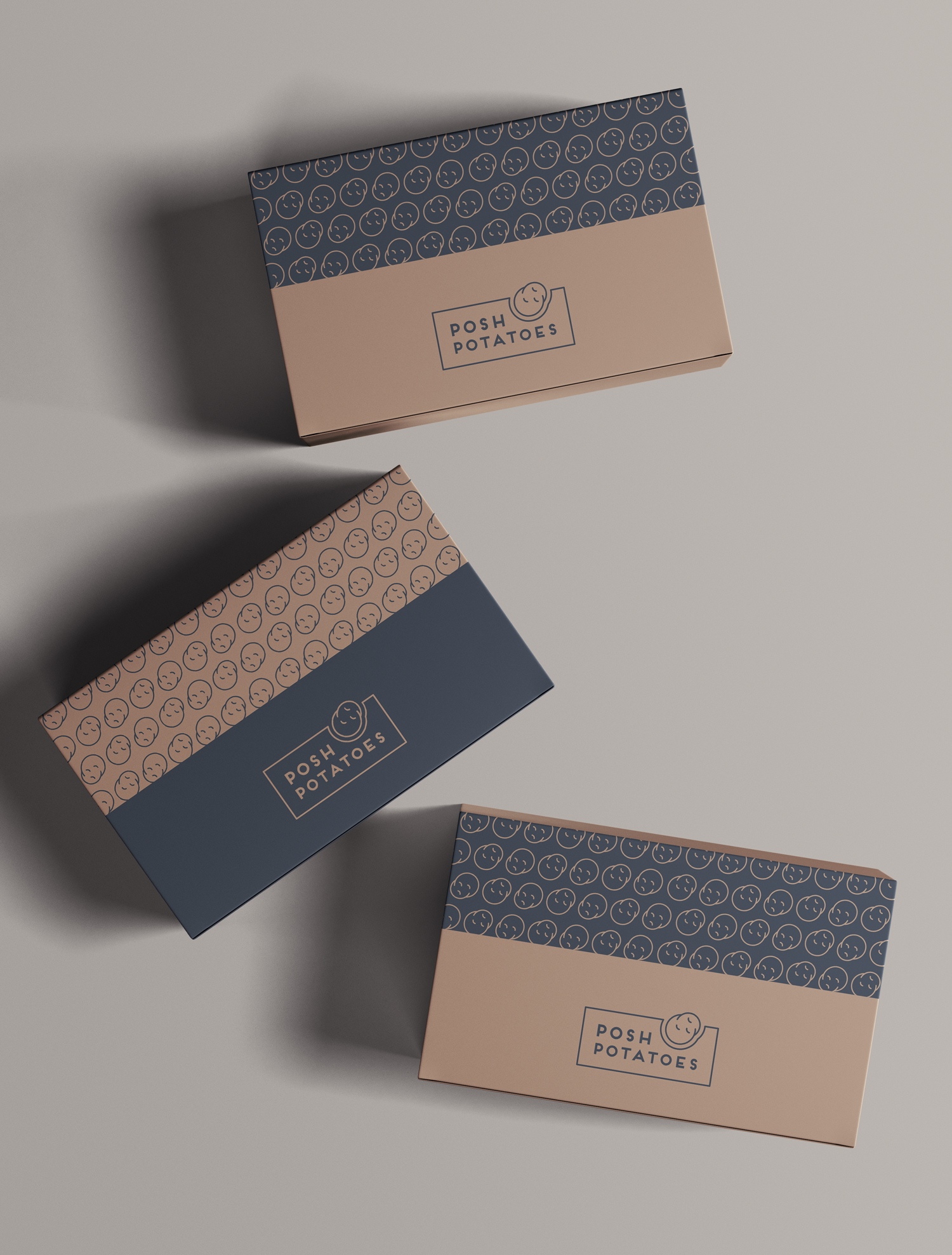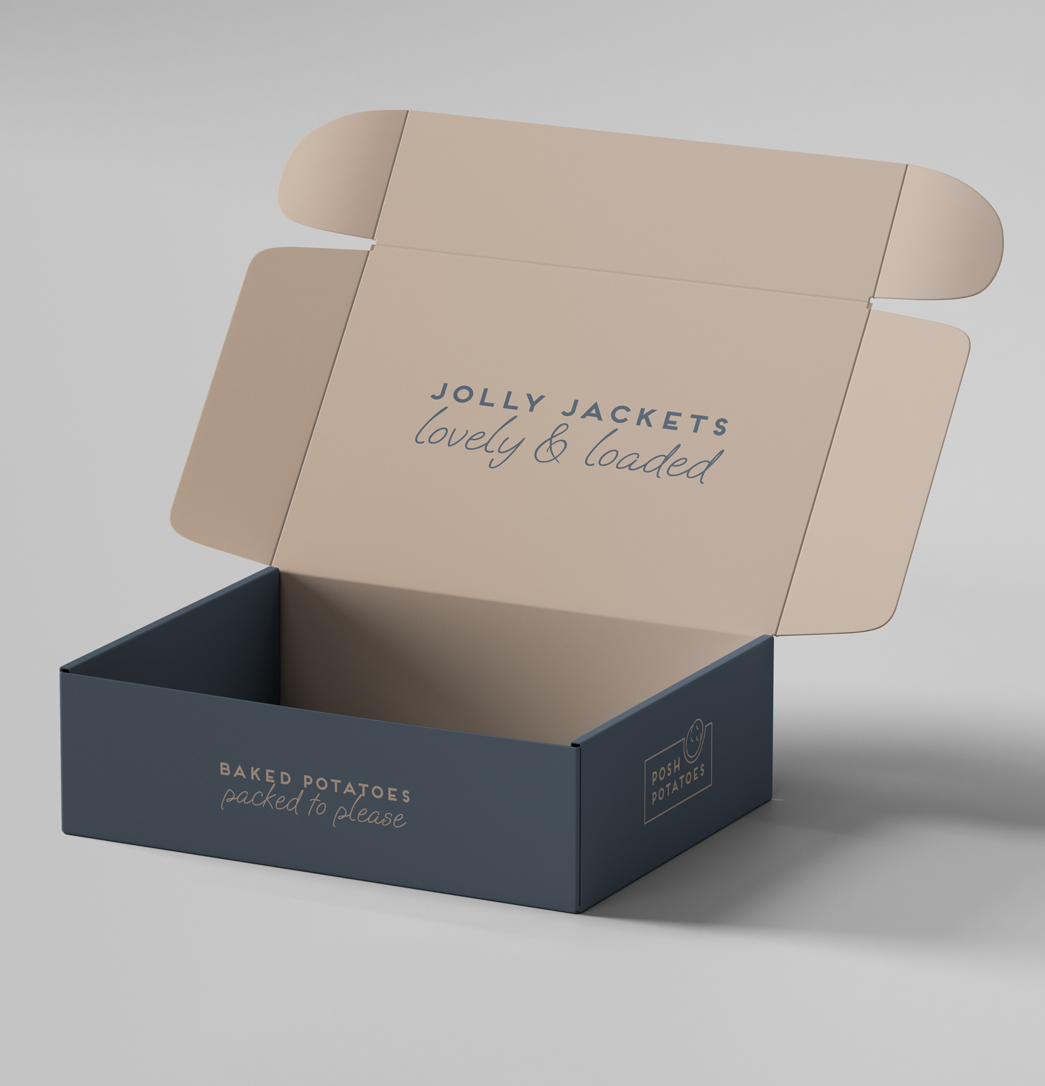 This branding represents a British-inspired restaurant named “Posh Potatoes,” which specializes in elevating the humble jacket potato—traditionally known as a street food—into a gourmet dining experience. The name “Posh Potatoes” reflects the client’s vision of making this classic dish accessible and enjoyable, whether at home, in a bustling office, or on the go.